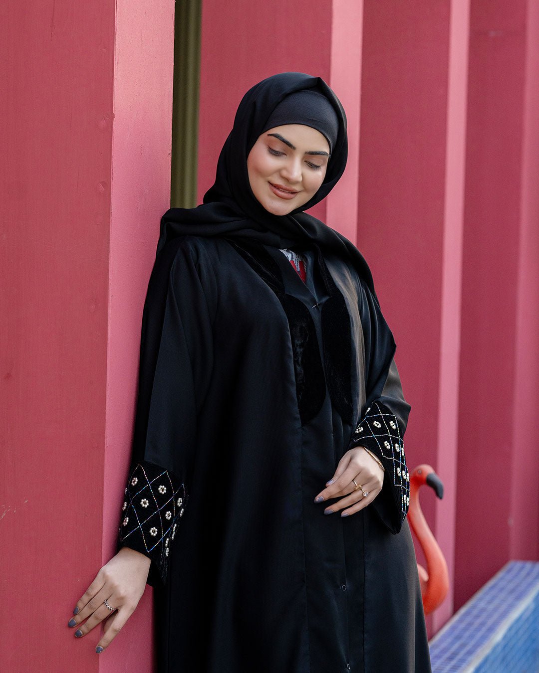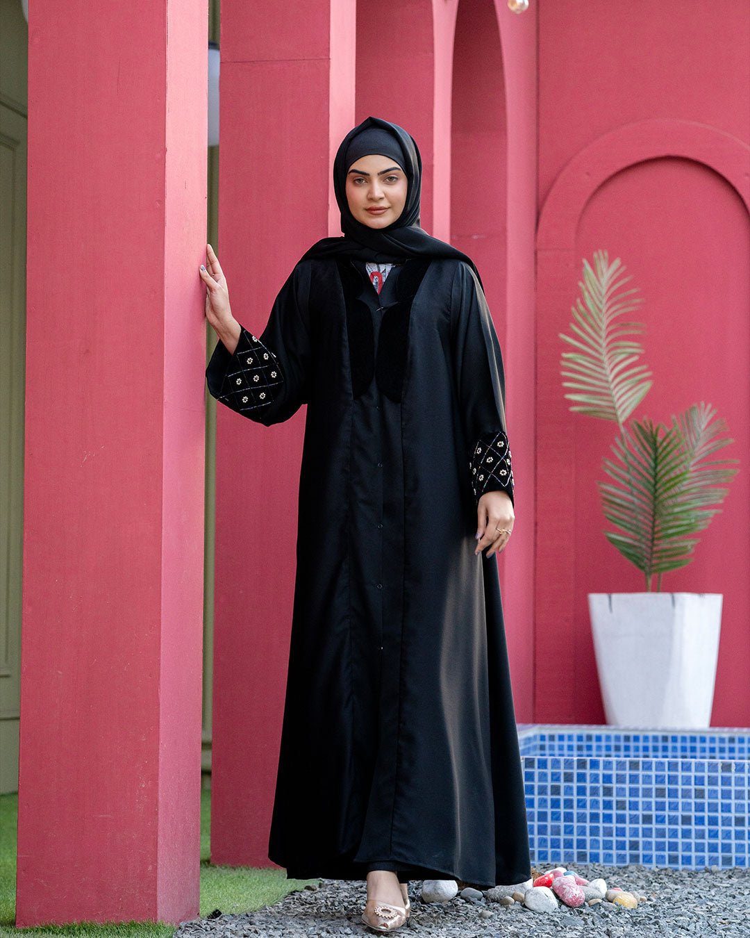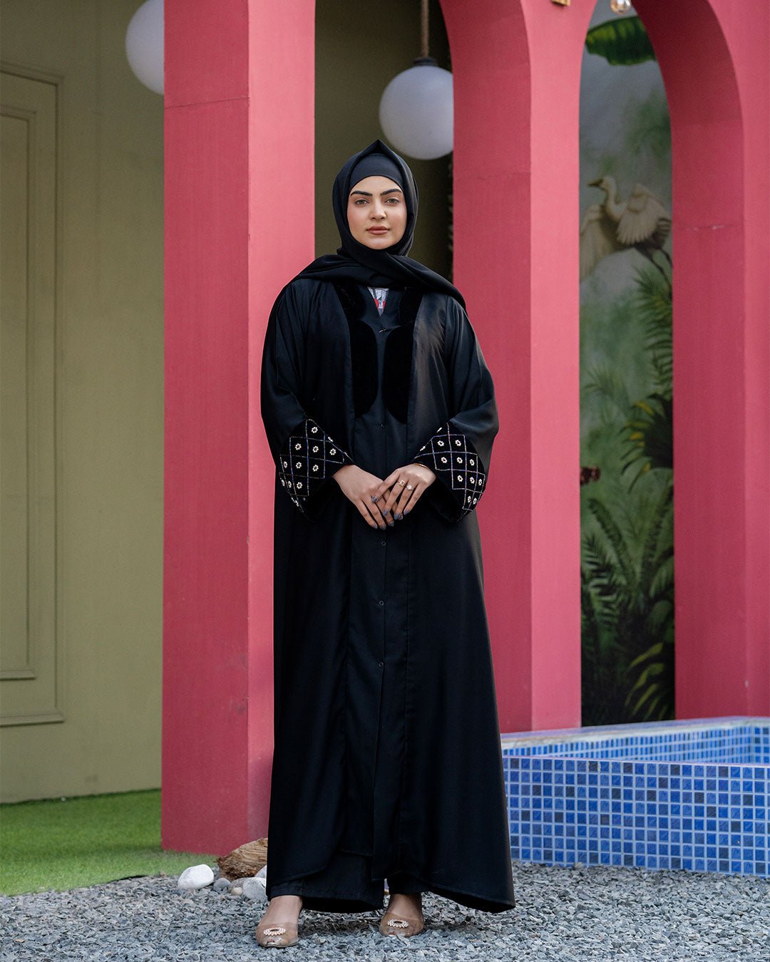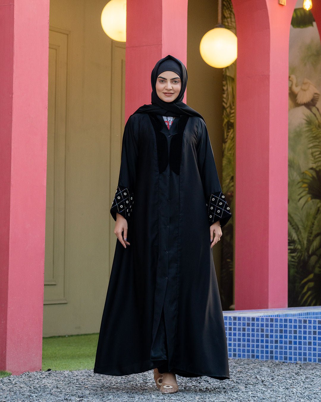 Description : This abaya offers A smooth, breathable feel with a graceful, flowing drape. The minimalist black design is elevated by Sophisticatedly embroidered details on the sleeves, & Beautiful Velvet design on front adding a refined statement while maintaining understated elegance. Designed for comfort and versatility, it transitions effortlessly from daily wear to polished outings, making it a timeless essential for the modern modest wardrobe.