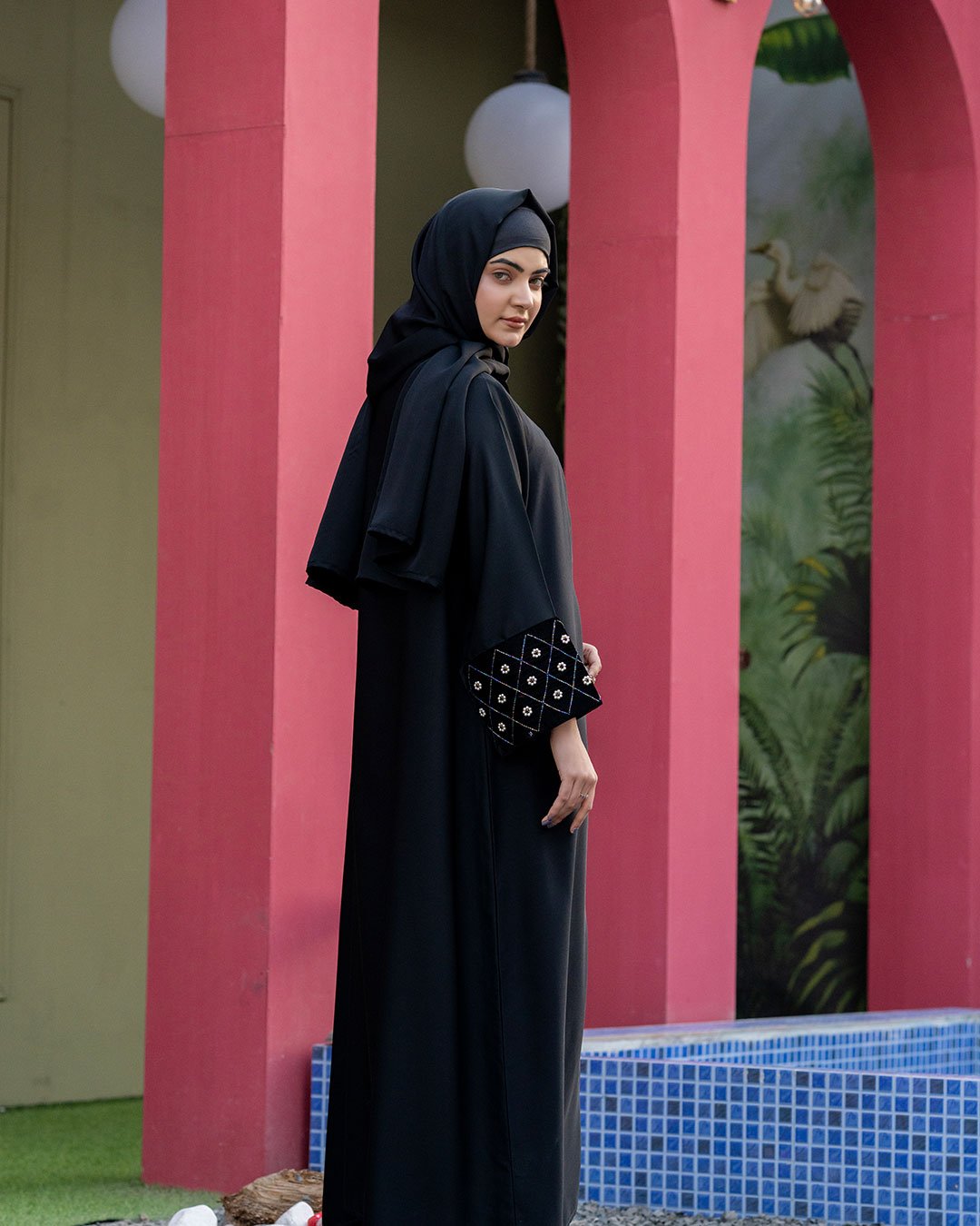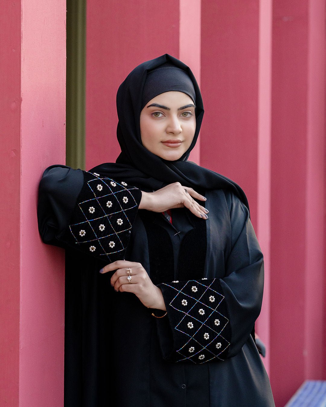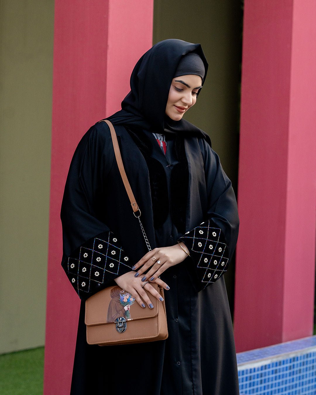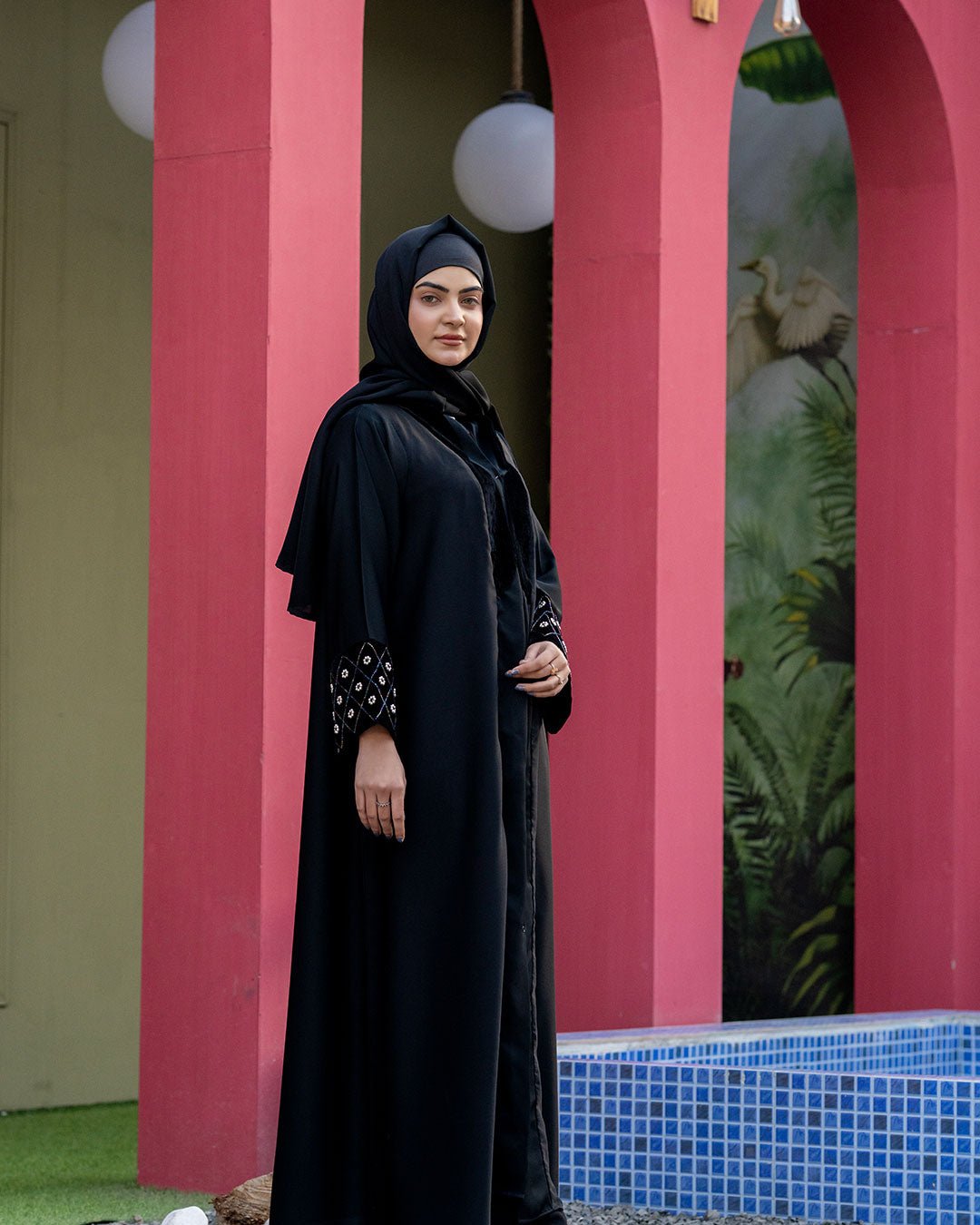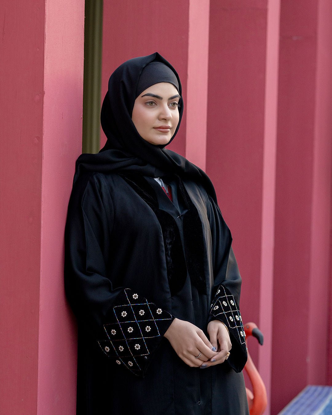 Description : This abaya offers A smooth, breathable feel with a graceful, flowing drape. The minimalist black design is elevated by Sophisticatedly embroidered details on the sleeves, & Beautiful Velvet design on front adding a refined statement while maintaining understated elegance. Designed for comfort and versatility, it transitions effortlessly from daily wear to polished outings, making it a timeless essential for the modern modest wardrobe.